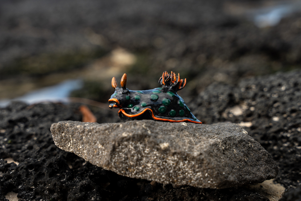 Each model is carefully 3D printed and then individually hand-painted, capturing the electric black body, deep green dots, and vivid orange rhinophores that make this species so unmistakable. No two pieces are exactly alike—each one is a small, unique tribute to marine life.