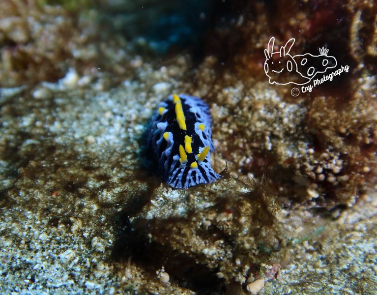 Phyllidia marindica is a bold and easily recognizable nudibranch, thanks to its black body covered in raised blue and yellow ridges and tubercles. Like other members of the Phyllidia family, it doesn’t have external gills and uses its entire body surface to breathe. It feeds on sponges and produces chemical compounds that make it distasteful to predators — a fact it advertises through its striking warning colors. Often active during the day, it’s one of the more visible species on Mauritian reefs. - Phyllidia ocellata