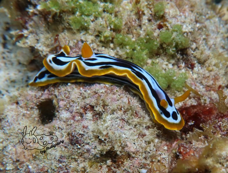 Fun Fact: Chromodoris cf. strigata’s vibrant blue and black stripes warn predators of its toxic defenses — a classic example of aposematic coloration in nudibranchs.
