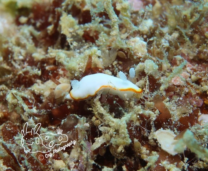 This elegant nudibranch adds a splash of color to coral reefs with its white body and vivd orange/yellow border. A favorite of underwater photographers and keen-eyed divers, it’s a dazzling reminder of reef diversity.