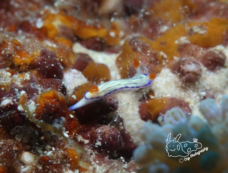 This graceful nudibranch glides over sponges and rubble slopes, its sleek lines and contrasting colors making it a favorite among divers and underwater photographers.