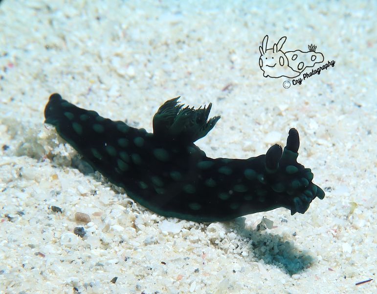 Fun Fact: Nembrotha cristata is instantly recognizable by its sleek black body adorned with bright green spots, making it a striking and unforgettable presence on any coral reef.