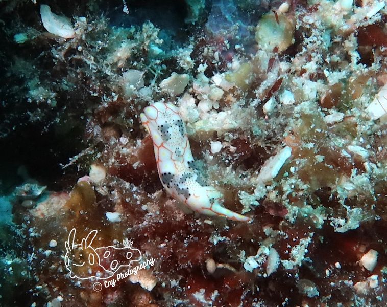 This small but striking slug is a master of subtle elegance, its delicate patterns blending perfectly with the reef’s algae and sandy patches. It’s a delightful find for macro photographers and marine enthusiasts!