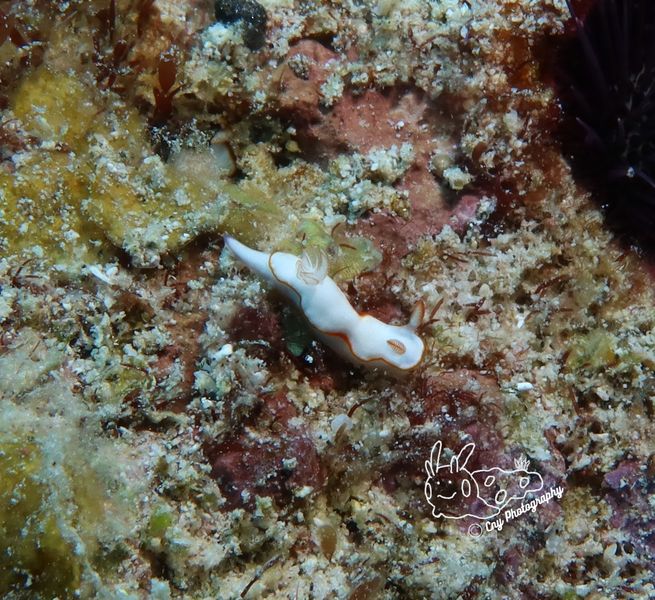 Fun Fact: Thorunna horologia is named for its elegant, clock-like appearance — a delicate white body adorned with fine orange lines and bright orange-tipped gills and rhinophores!